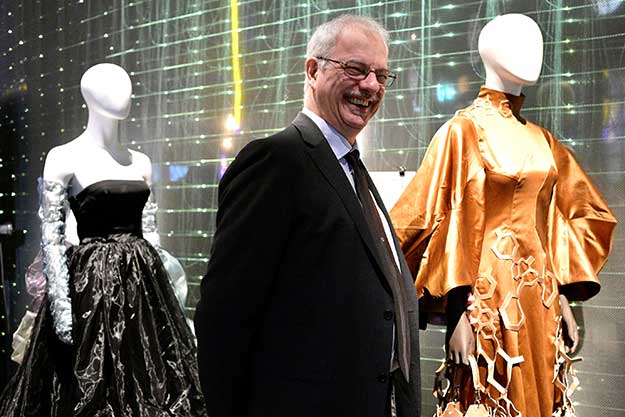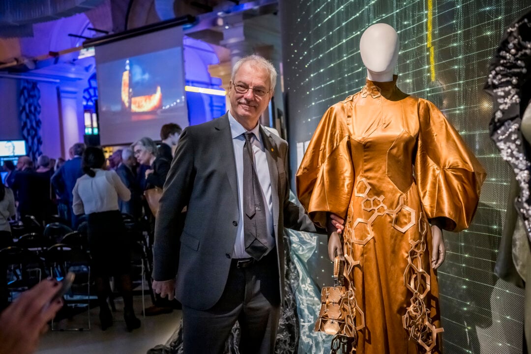 13 (of 14) Morten Meldal in front of a dress inspired by his prize. The dress is made by students from Beckmans College of Design in Stockholm.