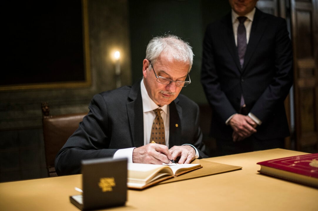 6 (of 14) Morten Meldal signs the Nobel Foundation's guest book, signed by the laureates since 1952, during his visit to the Nobel Foundation on 12 December 2022.