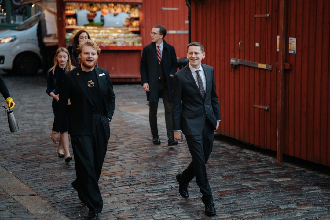 9 (of 12) Chemistry laureate John Jumper (right) arriving at the laureates' get together at the Nobel Prize Museum in Stockholm on 6 December 2024.