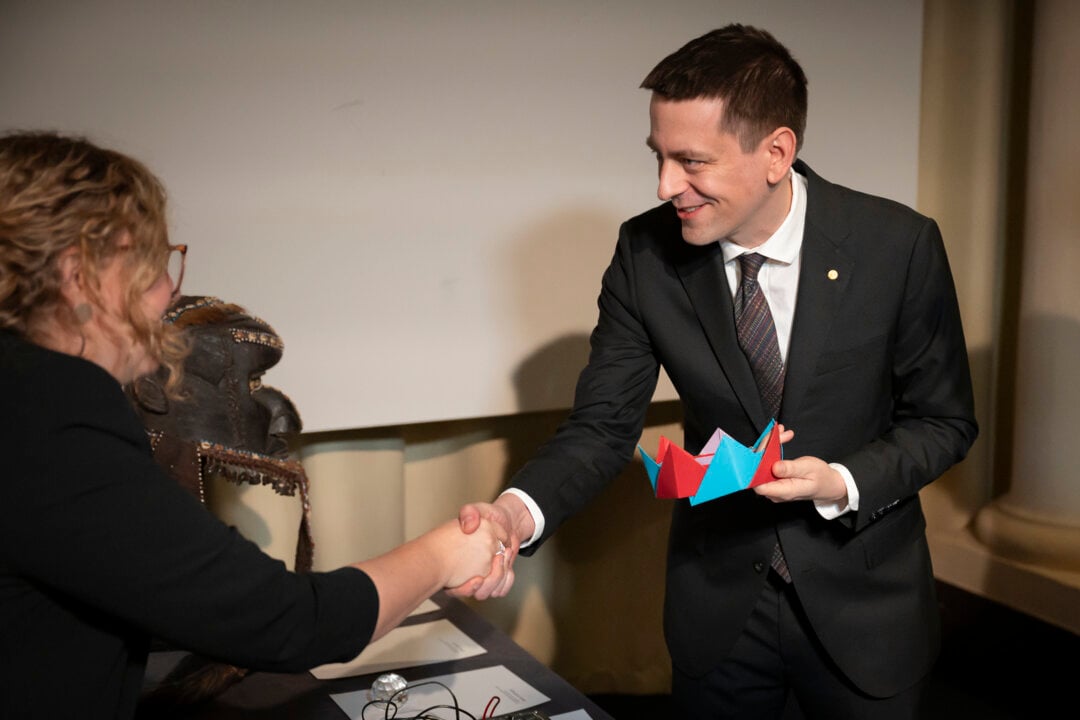 11 (of 12) John Jumper presenting his gift to the Nobel Museum's collection during the laureates' get together on 6 December 2024: an origami paper crown. His team was called the origami team when they started working on folded proteins. Therefore, an origami paper crown was folded and passed around between team members when someone had done something good.