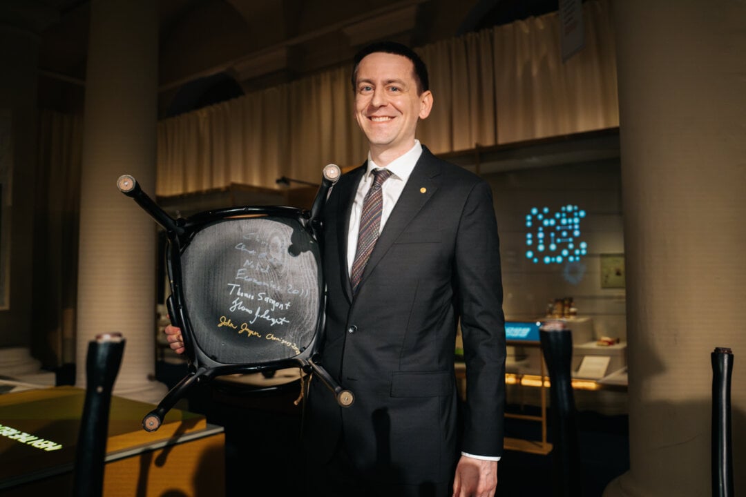10 (of 12) Like many laureates before him, chemistry laureate John Jumper signed a chair at the laureates' get together at the Nobel Prize Museum in Stockholm on 6 December 2024.