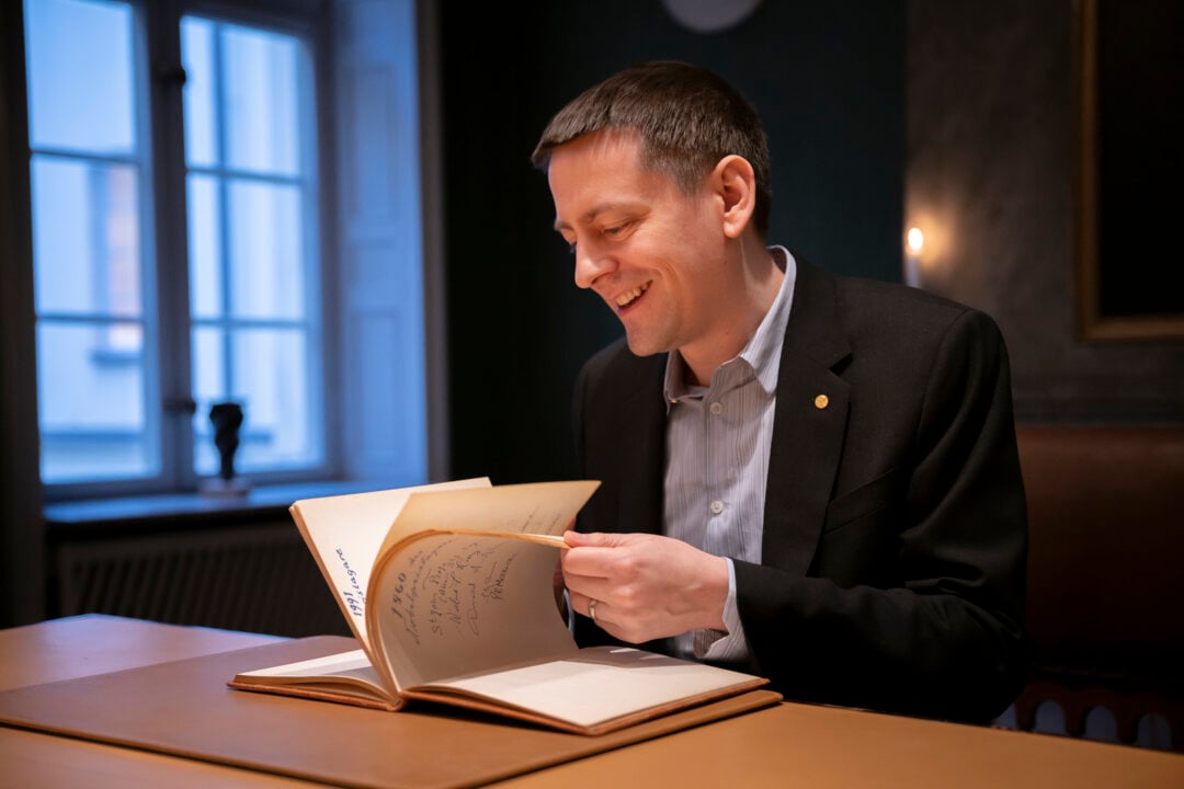5 (of 12) John Jumper takes a look in the Nobel Foundation's guest book, signed by the laureates since 1952, during his visit to the Nobel Foundation on 12 December 2024.