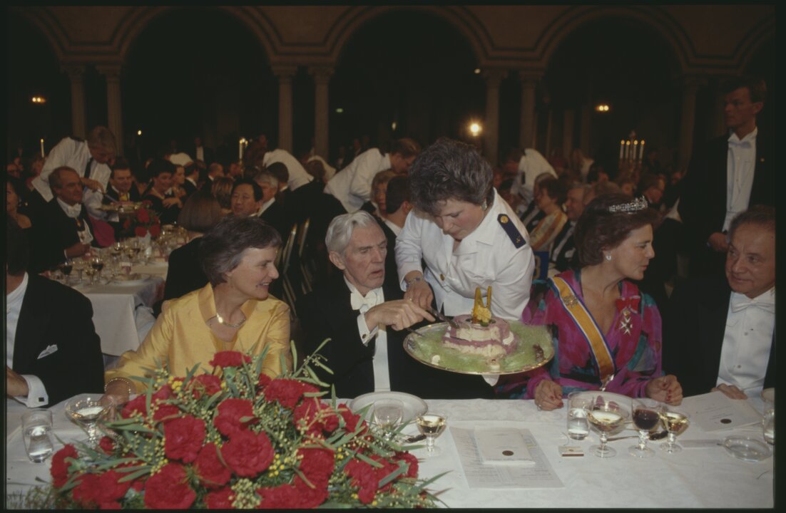 4 (of 6) Laureate in economic sciences Trygve Haavelmo being served the dessert at the Nobel Banquet in the Stockholm City Hall, Sweden, on 10 December 1989.