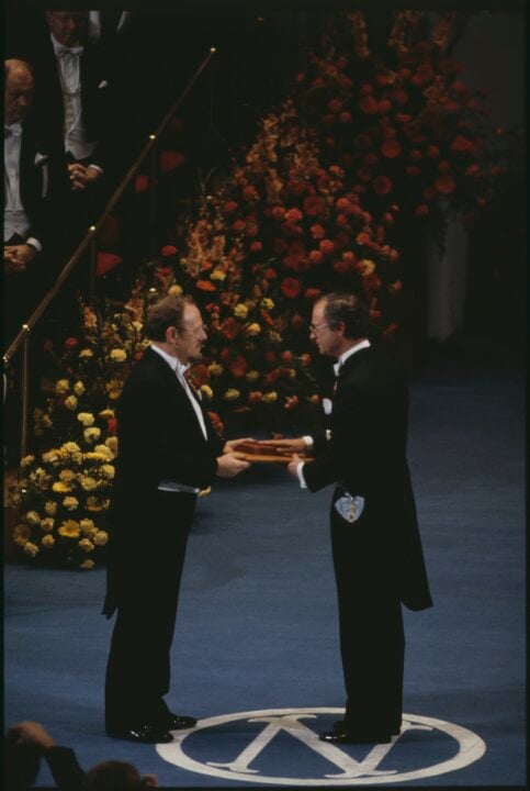 3 (of 7) All 1990 Nobel Prize laureates assembled on stage at the Nobel Prize award ceremony in Stockholm, Sweden on 10 December 1990: physics laureates Jerome I. Friedman, Henry W. Kendall and Richard E. Taylor, Chemistry laureate Elias James Corey, medicine laureates Joseph E. Murray and E. Donnall Thomas, literature laureate Octavio Paz and economic sciences laureates Harry M. Markowitz, Merton H. Miller and William F. Sharpe.