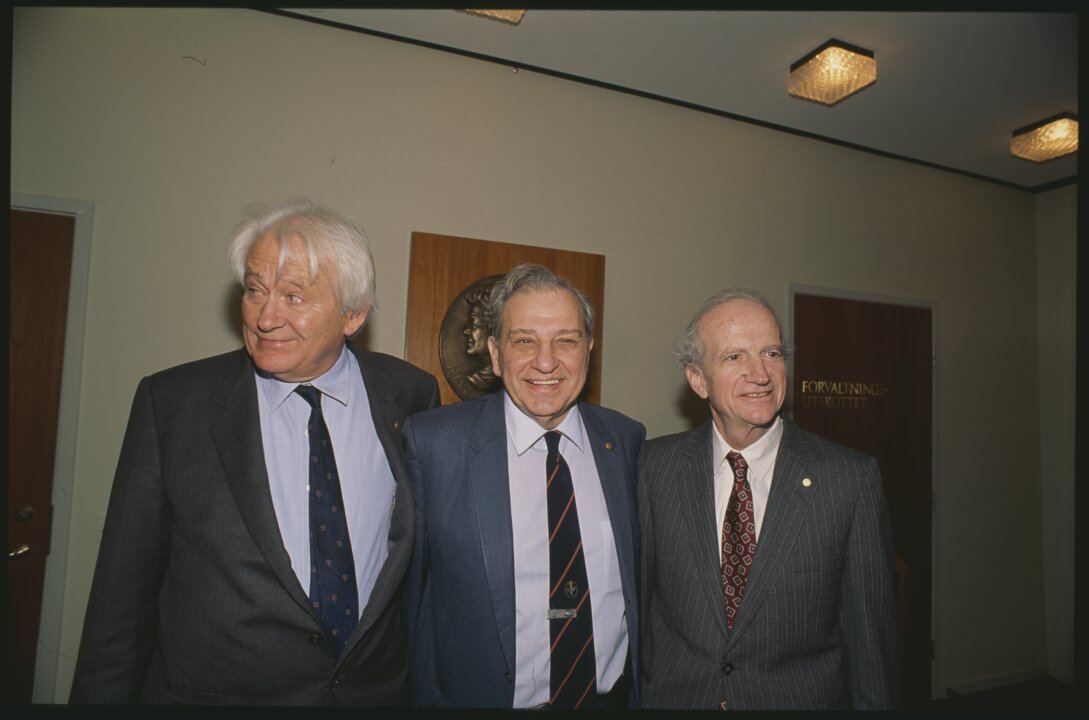 5 (of 5) Physics laureate Georges Charpak, chemistry laureate Rudolph A. Marcus and laureate in economic sciences Gary S. Becker photographed during Nobel Week in Stockholm, Sweden, December 1992.