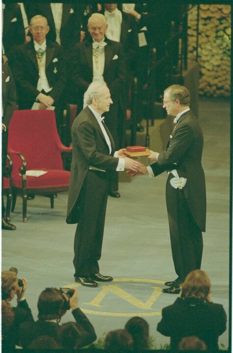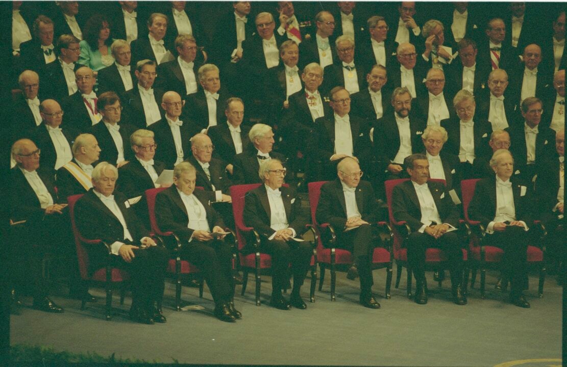 2 (of 5) 1992 Nobel Prize laureates on stage at the Nobel Prize award ceremony at the Stockholm Concert Hall on 10 December 1992. From left: physics laureate Georges Charpak, chemistry laureate Rudolph A. Marcus, medicine laureates Edmond H. Fischer and Edwin G. Krebs, literature laureate Derek Walcott and laureate in economic sciences Gary S. Becker