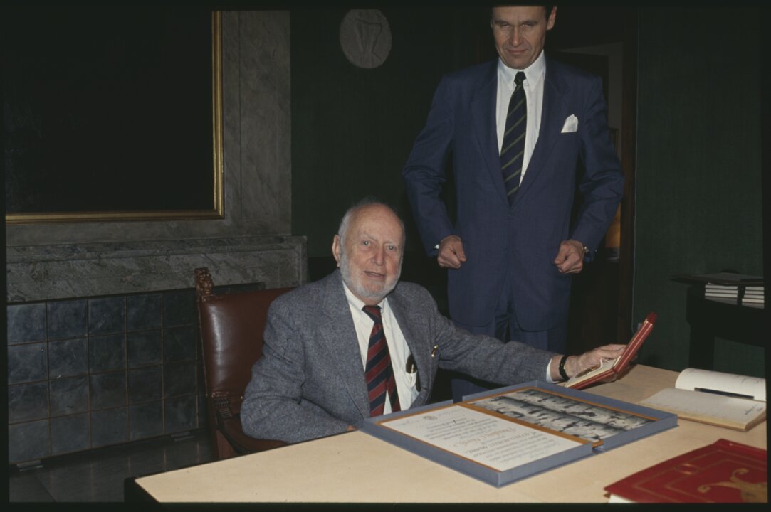 Douglass C. North having a look at his diploma and medal during a visit to the Nobel Foundation in December 1993.
