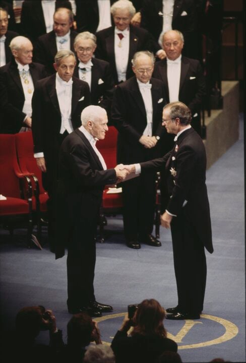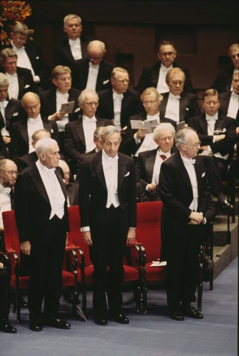 3 (of 8) 1994 laureates on stage at the Nobel Prize award ceremony at the Stockholm Concert Hall on 10 December 1994. From left: physic laureates Bertram N. Brockhouse and Clifford G. Shull, chemistry laureate George A. Olah, medicine laureates Alfred G. Gilman and Martin Rodbell, literature laureate Kenzaburo Oe and economic sciences laureates John C. Harsanyi, John F. Nash Jr. and Reinhard Selten.