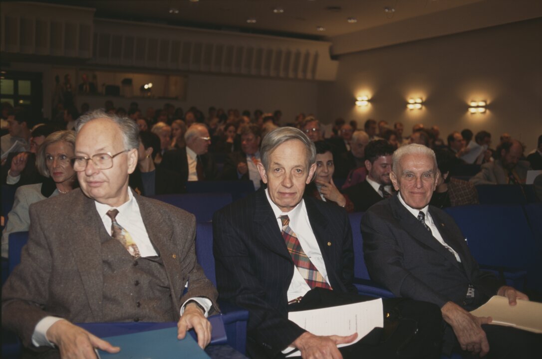 6 (of 8) Reinhard Selten, John F. Nash Jr. and John C. Harsanyi photographed during Nobel Week in Stockholm, Sweden, December 1994.
