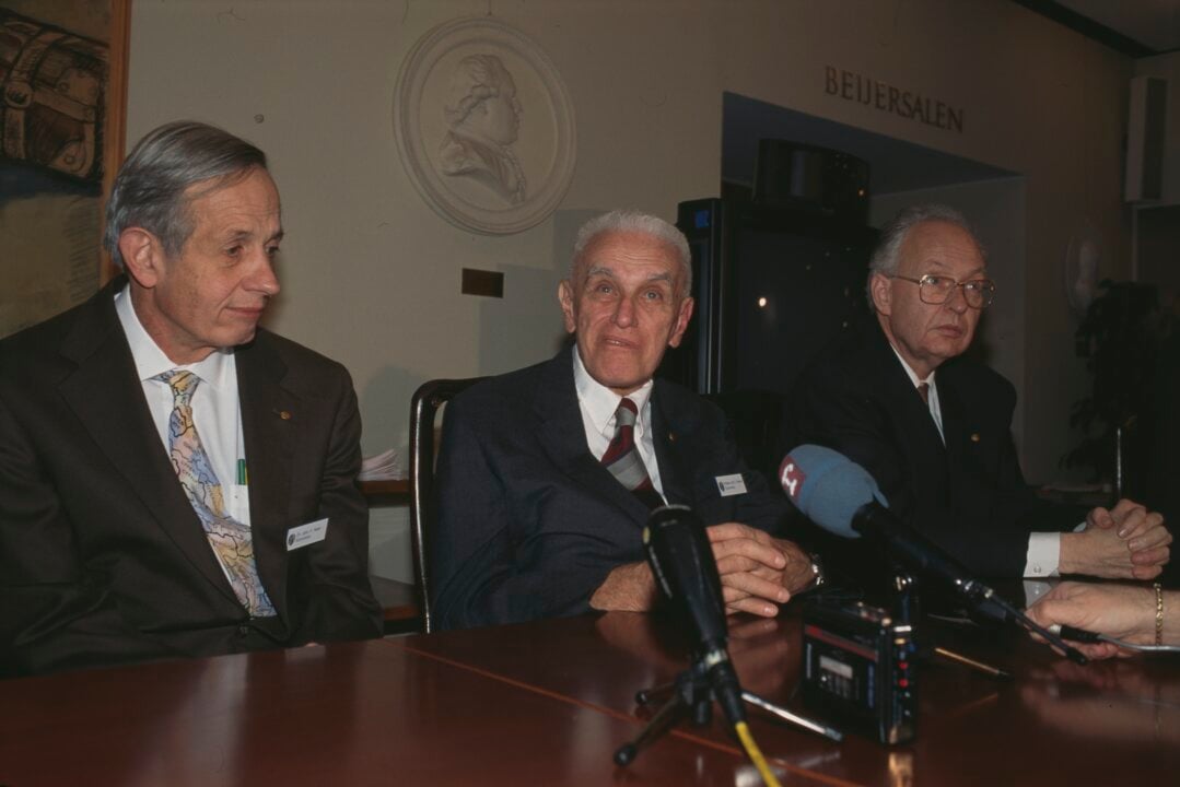 7 (of 8) John F. Nash Jr., John C. Harsanyi and Reinhard Selten during a press conference during Nobel Week in Stockholm, Sweden, December 1994.