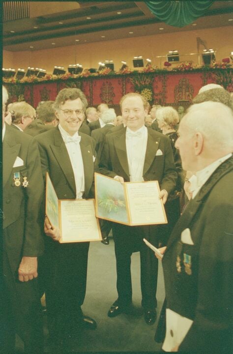 6 (of 12) Myron S. Scholes and Robert C. Merton showing their diplomas after the Nobel Prize award ceremony in Stockholm, Sweden on 10 December 1997.