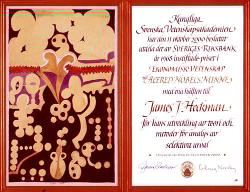 James J. Heckman Diploma Navigate to: Summary-- Facts-- Biographical-- Prize Lecture-- Prize presentation-- Interview-- Diploma-- Photo gallery-- Other resources- Daniel L. McFadden Prize announcement Press release Popular information Advanced information Award ceremony video Award ceremony speech Banquet video Copyright © The Nobel Foundation 2000 Artist: Nils G. Stenqvist Calligrapher: Annika Rücker Go to the top of the page