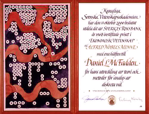Daniel L. McFadden Diploma Navigate to: Summary- James J. Heckman-- Facts-- Biographical-- Prize Lecture-- Banquet speech-- Prize presentation-- Interview-- Diploma-- Photo gallery-- Other resources Prize announcement Press release Popular information Advanced information Award ceremony video Award ceremony speech Banquet video Copyright © The Nobel Foundation 2000 Artist: Nils G. Stenqvist Calligrapher: Annika Rücker Go to the top of the page