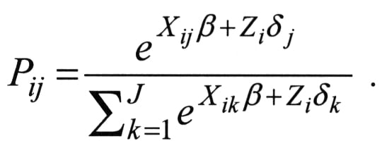 McFadden’s seminal contribution is his development of so-called conditional logit analysis in 1974. In order to describe this model, suppose that each individual in a population faces a number (say, J) of alternatives. Let X denote the characteristics associated with each alternative and Z the characteristics of the individuals that the researcher can observe in his data. In a study of the choice of travel mode, for instance, where the alternatives may be car, bus or subway, X would then include information about time and costs, while Z might cover data on age, income and education. But differences among individuals and alternatives other than X and Z, although unobservable to the researcher, also determine an individual’s utility-maximizing choice. Such characteristics are represented by random “error terms”. McFadden assumed that these random errors have a specific statistical distribution (termed an extreme value distribution) in the population. Under these conditions (plus some technical assumptions), he demonstrated that the probability that individual i will choose alternative j can be written as: