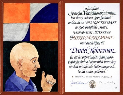 Daniel Kahneman Diploma Navigate to: Summary-- Facts-- Biographical-- Prize Lecture-- Prize presentation-- Podcast-- Interview-- Diploma-- Photo gallery-- Other resources- Vernon L. Smith Press release Popular information Advanced information Award ceremony video Award ceremony speech Banquet video Copyright © The Nobel Foundation 2002 Artist: Nils G. Stenqvist Calligrapher: Annika Rücker Go to the top of the page