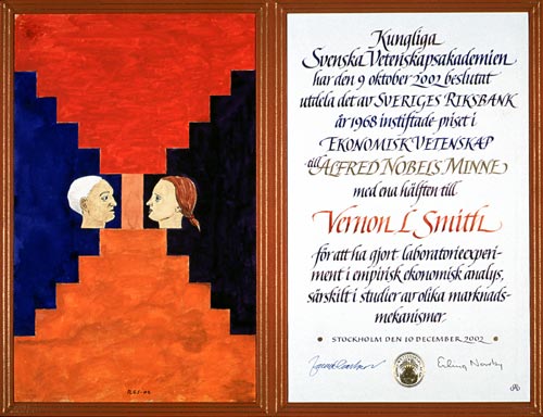 Vernon L. Smith Diploma Navigate to: Summary- Daniel Kahneman-- Facts-- Biographical-- Prize Lecture-- Banquet speech-- Prize presentation-- Interview-- Diploma-- Photo gallery-- Other resources Press release Popular information Advanced information Award ceremony video Award ceremony speech Banquet video Copyright © The Nobel Foundation 2002 Artist: Nils G. Stenqvist Calligrapher: Annika Rücker Go to the top of the page