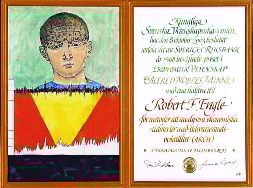 Robert F. Engle III Diploma Navigate to: Summary-- Facts-- Biographical-- Prize Lecture-- Prize presentation-- Interview-- Diploma-- Photo gallery-- Other resources- Clive W.J. Granger Prize announcement Press release Popular information Advanced information Award ceremony video Award ceremony speech Banquet video Copyright © The Nobel Foundation 2003 Artist: Nils G. Stenqvist Calligrapher: Annika Rücker Go to the top of the page