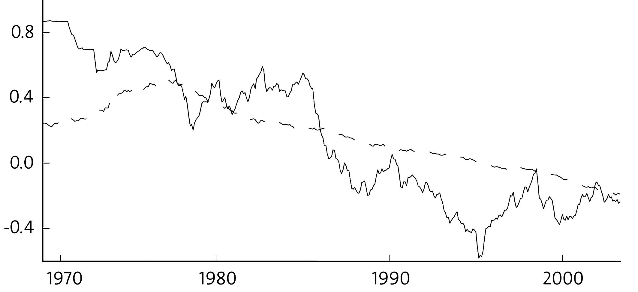 | Figure 1: Logarithm of the Japanese yen/U.S. dollar exchange-rate index and the logarithm of the quotient between the consumer price index for Japan and the consumer price index for the U.S.; monthly observations, January 1970–May 2003. |