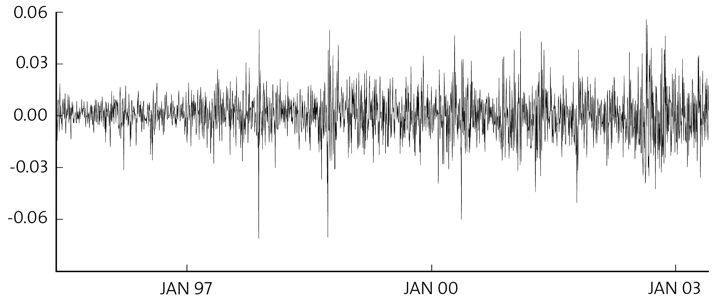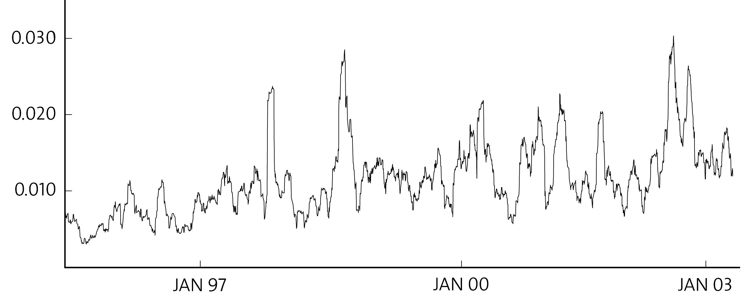 Figure 2 shows the returns on an investment in the NYSE stock index (the Standard & Poor 500) for all stock-market days between May 1995 and April 2003. The returns averaged 5.3 percent per year. At the same time there were days, when the fluctuations in prices were greater (plus or minus) than 5 percent. The standard deviation* in daily returns measured over the entire period was 1.2 percent. Closer inspection reveals, however, that the volatility varies over time: large changes (upwards or downwards) are often followed by further large fluctuations, and small changes tend to be followed by small fluctuations. This is clearly illustrated in Figure 3, which shows how the standard deviation, measured over the last four weeks, moved over time. Evidently, the standard deviation varied considerably, from approximately 0.5 percent during calm periods to nearly 3 percent during more turbulent episodes. Many financial time series are characterized by similar time variation in volatility.
