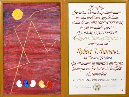 Robert J. Aumann Diploma Navigate to: Summary-- Facts-- Biographical-- Prize Lecture-- Banquet speech-- Prize presentation-- Interview-- Diploma-- Photo gallery-- Other resources- Thomas C. Schelling Prize announcement Press release Popular information Advanced information Award ceremony video Award ceremony speech Banquet video Copyright © The Nobel Foundation 2005 Artist: Ulla Kraitz Calligrapher: Annika Rücker Photo reproduction: Fredrika Berghult Go to the top of the page
