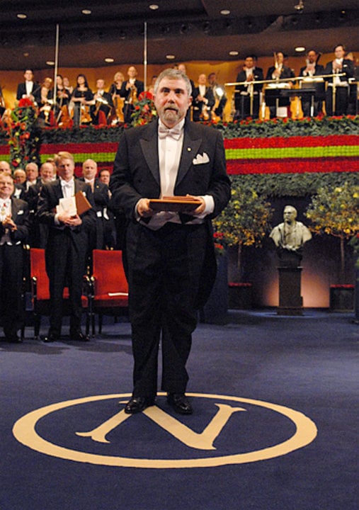 Paul Krugman receiving his Prize from His Majesty King Carl XVI Gustaf of Sweden at the Stockholm Concert Hall, 10 December 2008.