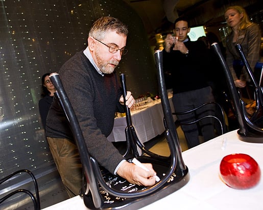 11 (of 15) Paul Krugman, like many Laureates before him, autographs a chair at Kafé Satir at the Nobel Museum in Stockholm, 6 December 2008.