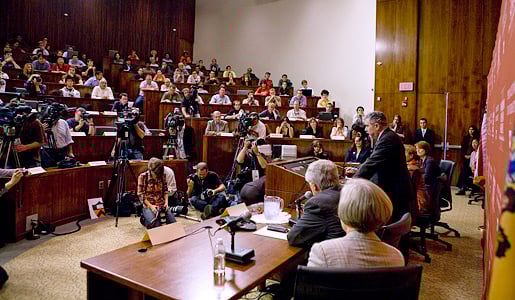 13 (of 15) Princeton faculty, students, administrators and members of the media packed Dodds Auditorium in Robertson Hall for a press conference in honour of Paul Krugman's Economics Prize.