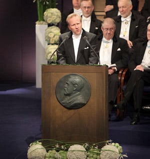 Professor Tore Ellingsen delivering the Presentation Speech for the Sveriges Riksbank Prize in Economic Sciences in Memory of Alfred Nobel 2009 at the Stockholm Concert Hall.