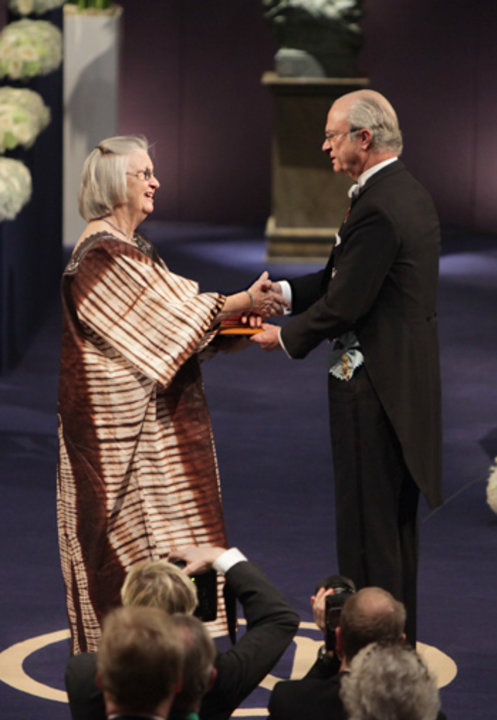 Elinor Ostrom receiving her Prize from His Majesty King Carl XVI Gustaf of Sweden at the Stockholm Concert Hall, 10 December 2009.