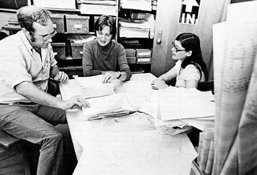 18 (of 18) At the workshop in Political Theory and Policy Analysis, political scientists Elinor Ostrom (center), Roger Parks (left) and Diane Eubanks (right) analyze data on American law enforcement agencies. The photo was taken in November, 1977.