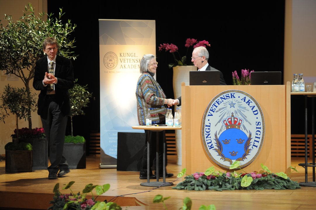 Elinor Ostrom and Oliver Williamson after delivering their Prize Lectures at the Aula Magna, Stockholm University, 8 December 2009.