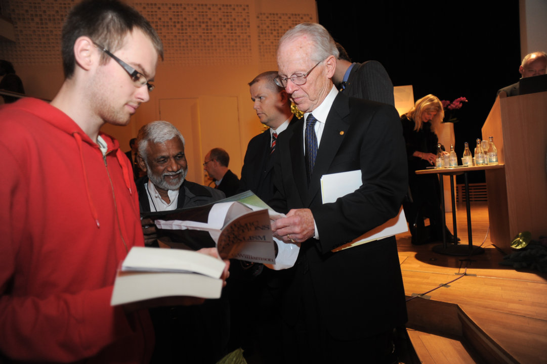 Oliver Williamson signing autographs for students after delivering his Prize Lecture at the Aula Magna, Stockholm University, 8 December 2009.