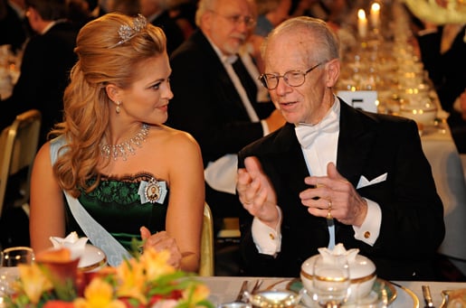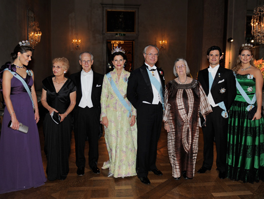 From left to right: Crown Princess Victoria, Mrs Dolores Williamson, Laureate Oliver E. Williamson, Her Majesty Queen Silvia, His Majesty King Carl XVI Gustaf of Sweden, Laureate Elinor Ostrom, Prince Carl Philip, and Princess Madeleine at the Nobel Banquet.