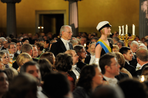 The 2009 Nobel Laureates stand for the Swedish national anthem (from left to right): Charles K. Kao, Willard S. Boyle, George E. Smith, Venkatraman Ramakrishnan, Thomas A. Steitz, Ada E. Yonath, Elizabeth H. Blackburn, Carol W. Greider, Jack W. Szostak, Herta Müller, Elinor Ostrom and Oliver E. Williamson.
