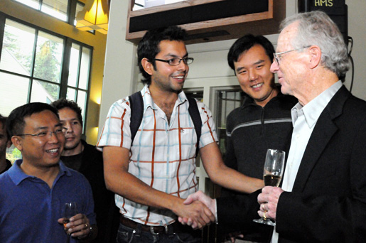 19 (of 21) Oliver Williamson (right) is congratulated by young students at a reception at Haas School of Business, UC Berkeley, 12 October, 2009.