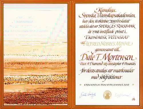 Dale T. Mortensen Diploma Navigate to: Summary- Peter A. Diamond-- Facts-- Biographical-- Prize Lecture-- Banquet speech-- Prize presentation-- Interview-- Diploma-- Photo gallery-- Other resources- Christopher A. Pissarides Prize announcement Press release Popular information Advanced information Illustrated information Speed read Award ceremony video Award ceremony speech Banquet video Copyright © The Nobel Foundation 2010 Artist: Sture Berglund Calligrapher: Annika Rücker Book binder: Ingemar Dackéus Photo reproduction: Lovisa Engblom Go to the top of the page