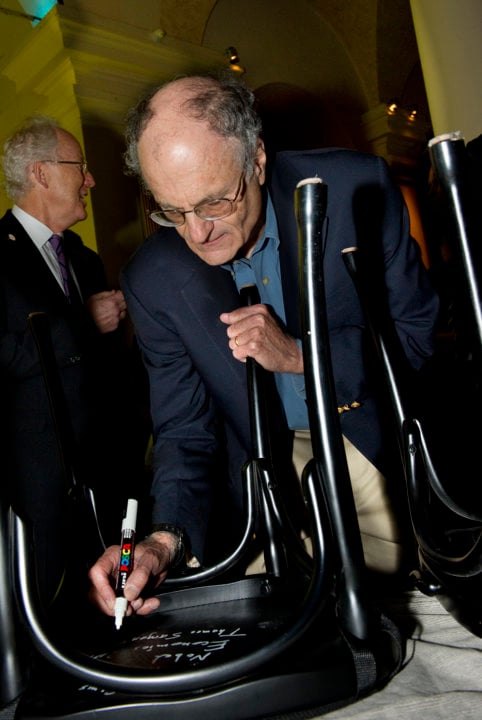 10 (of 18) Like many Laureates before him, Thomas J. Sargent autographs a chair at Bistro Nobel at the Nobel Museum in Stockholm, 6 December 2011.