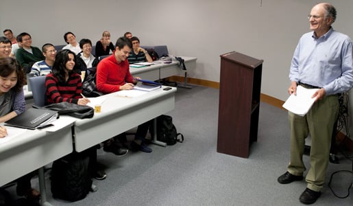 18 (of 18) Following the afternoon news conference and a celebratory reception honoring their 2011 Laureates in Economic Sciences, Thomas J. Sargent and Christopher A. Sims headed to co-teach a graduate course on advanced macroeconomic theory. Here, Christopher A. Sims sits behind the students and joins them in taking notes on the topic of Thomas J. Sargent's lesson; the two professors share duties of leading class lectures and discussions.