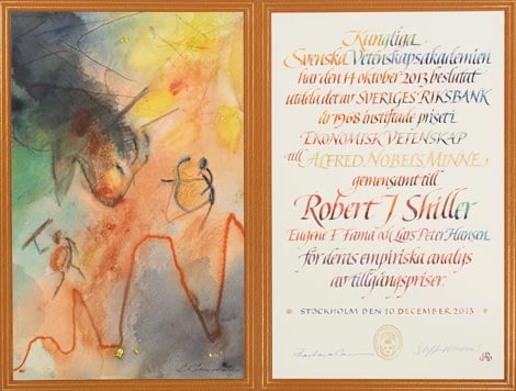 Robert J. Shiller Diploma Navigate to: Summary- Eugene F. Fama- Lars Peter Hansen-- Facts-- Biographical-- Prize Lecture-- Prize presentation-- Podcast-- Interview-- Diploma-- Photo gallery-- Other resources Prize announcement Press release Popular information Advanced information Award ceremony video Award ceremony speech Copyright © The Nobel Foundation 2013 Artist: Lena Cronström Calligrapher: Annika Rücker Book binder: Ingemar Dackéus Photo reproduction: Lovisa Engblom Go to the top of the page
