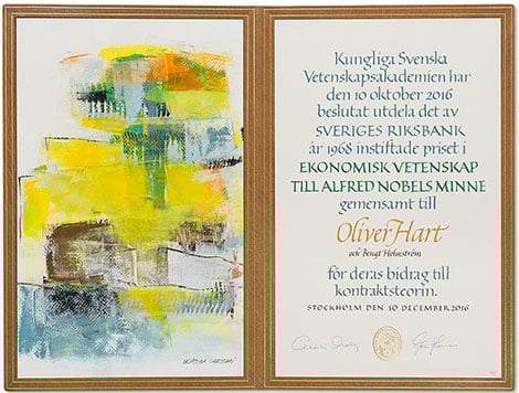 Oliver Hart Diploma Navigate to: Summary-- Facts-- Biographical-- Prize Lecture-- Banquet speech-- Prize presentation-- Podcast-- Interview-- Diploma-- Photo gallery-- Other resources- Bengt Holmström Prize announcement Press release Popular information Advanced information Award ceremony video Award ceremony speech Artist: Ullastina Larsson Calligrapher: Marie A. Györi Book binder: Leonard Gustafssons Bokbinderi AB Photo reproduction: Lovisa Engblom Copyright © The Nobel Foundation 2016 Go to the top of the page