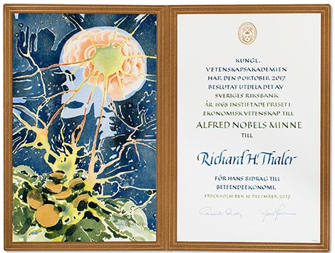 Richard H. Thaler Diploma Navigate to: Summary-- Facts-- Biographical-- Prize Lecture-- Prize presentation-- Banquet speech-- Podcast-- Interview-- Diploma-- Photo gallery-- Other resources Prize announcement Press release Advanced information Popular information Award ceremony video Award ceremony speech Artist: Ingela Berntsson Calligrapher: Marie A. Györi, monogram: Marianne Pettersson Soold Book binder: Leonard Gustafssons Bokbinderi AB Photo reproduction: Lovisa Engblom Copyright © The Nobel Foundation 2017 Go to the top of the page