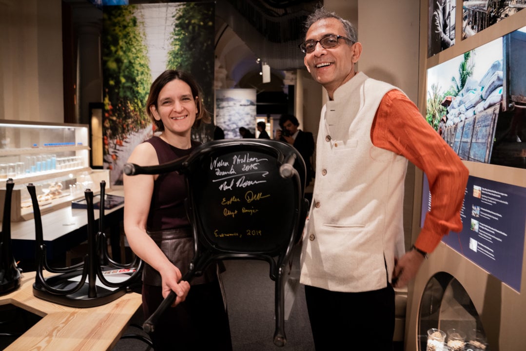 5 (of 8) 2019 Laureates Abhijit Banerjee and Esther Duflo signing a chair at Nobel Prize Museum during Nobel Week.