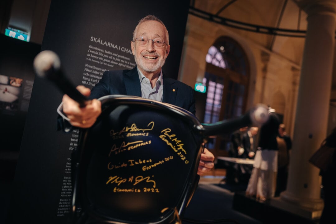 Paul R. Milgrom signing a chair at the Nobel Prize Museum.