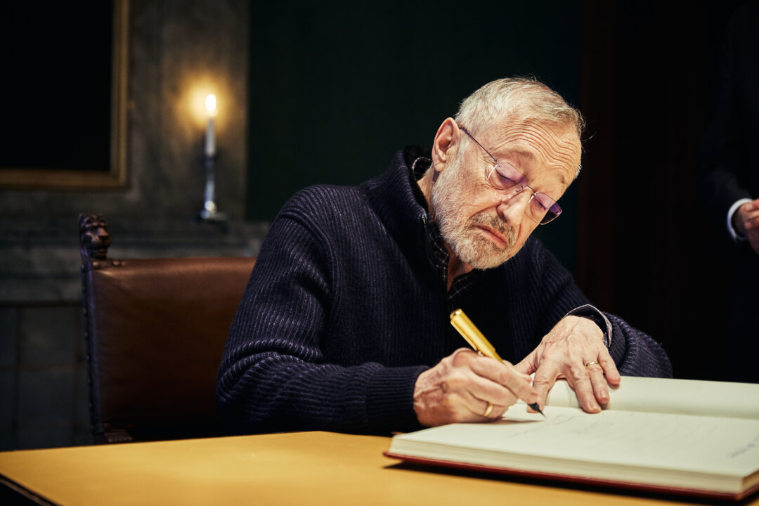 Paul R. Milgrom signs the Nobel Foundation's guest book, signed by the laureates since 1952, during his visit to the Nobel Foundation on 8 December 2022.