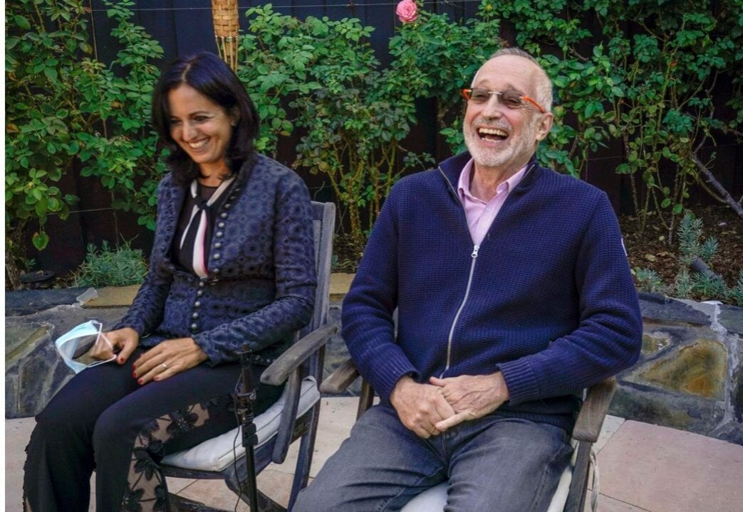 Professor Paul R. Milgrom, right, and Dr. Silvia Console Battilana, Auctionomics co-founder, left, share a laugh during an interview after the announcement of the 2020 Prize in Economic Sciences on 12 October 2020.