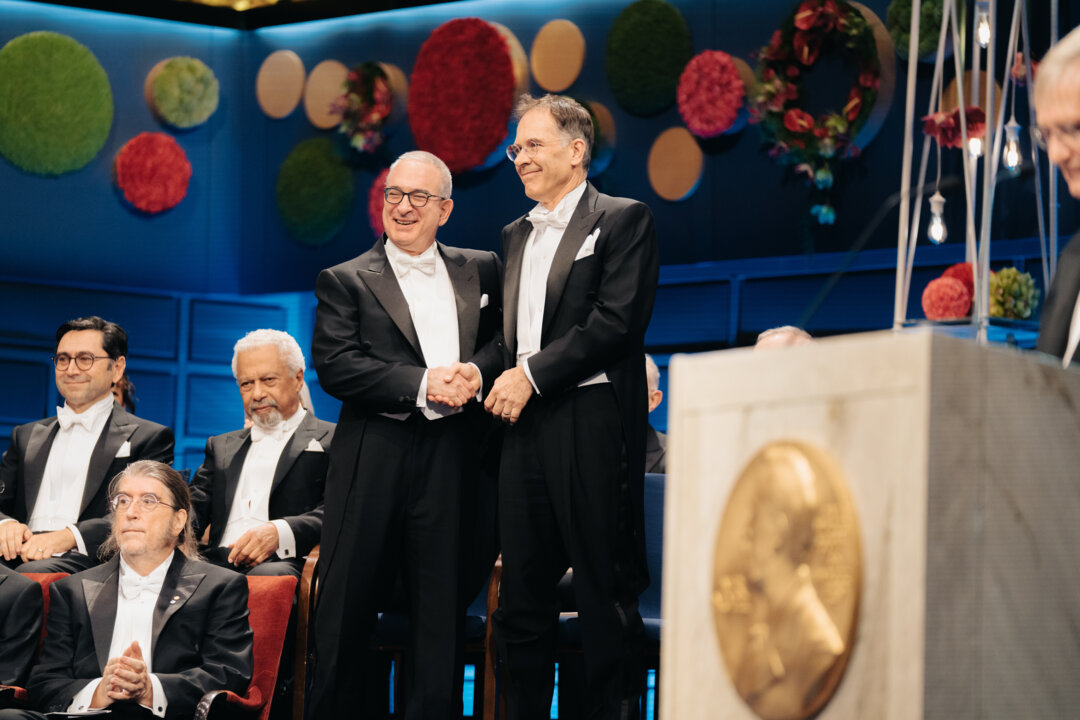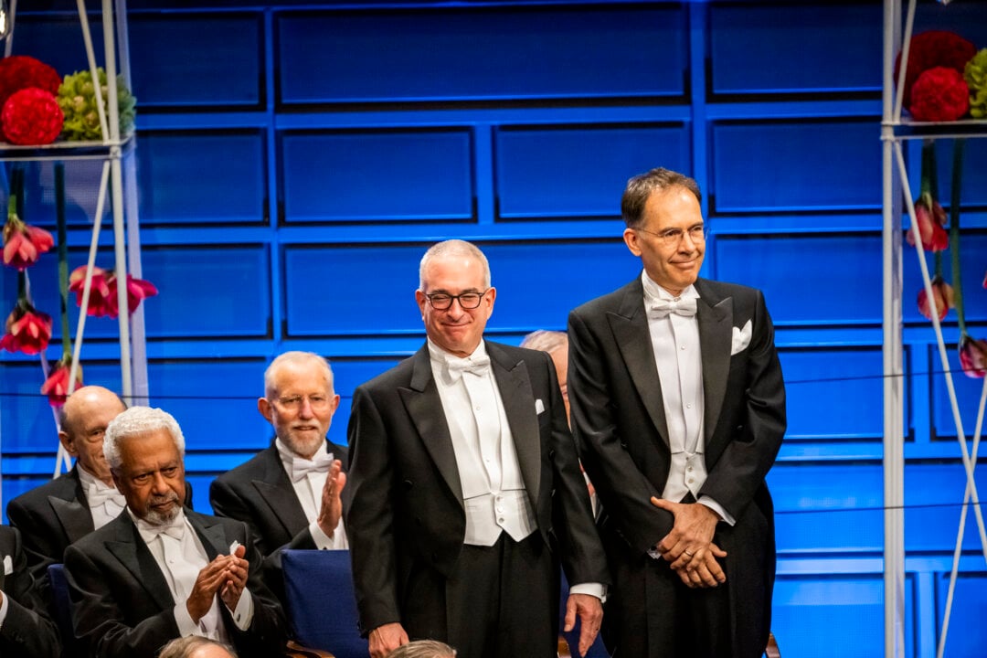 Economic sciences laureates Joshua D. Angrist and Guido W. Imbens at the Nobel Prize award ceremony in Stockholm, Sweden on 10 December 2022.