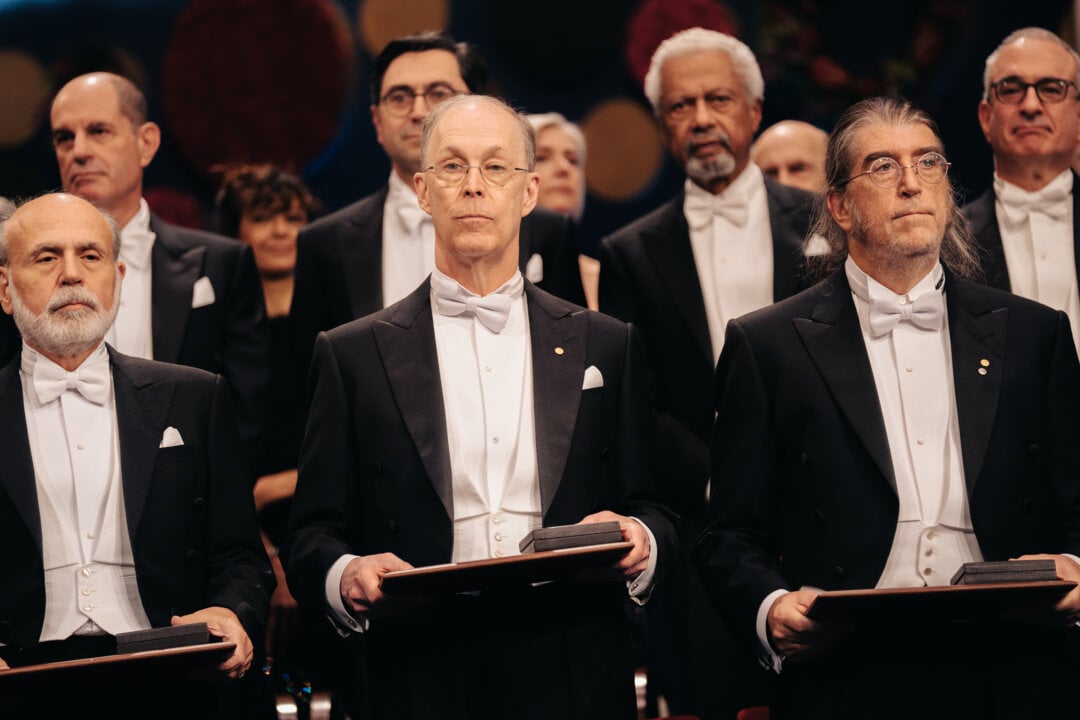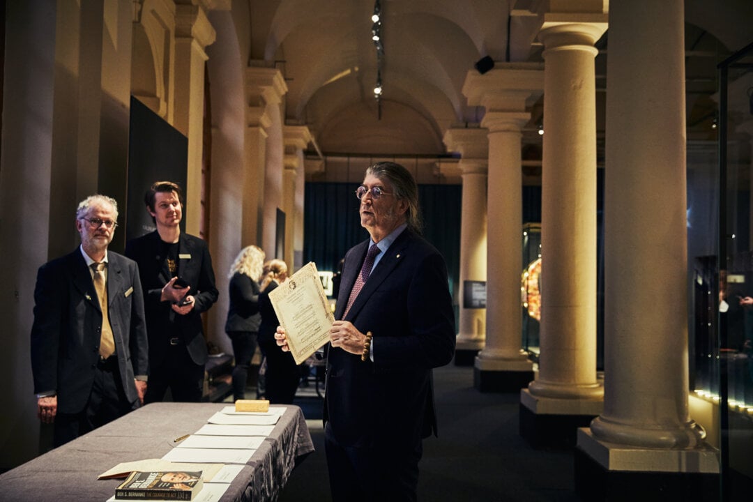 Laureates in economic sciences Ben Bernanke, Douglas Diamond and Philip Dybvig at the Nobel Prize award ceremony, 10 December 2022.