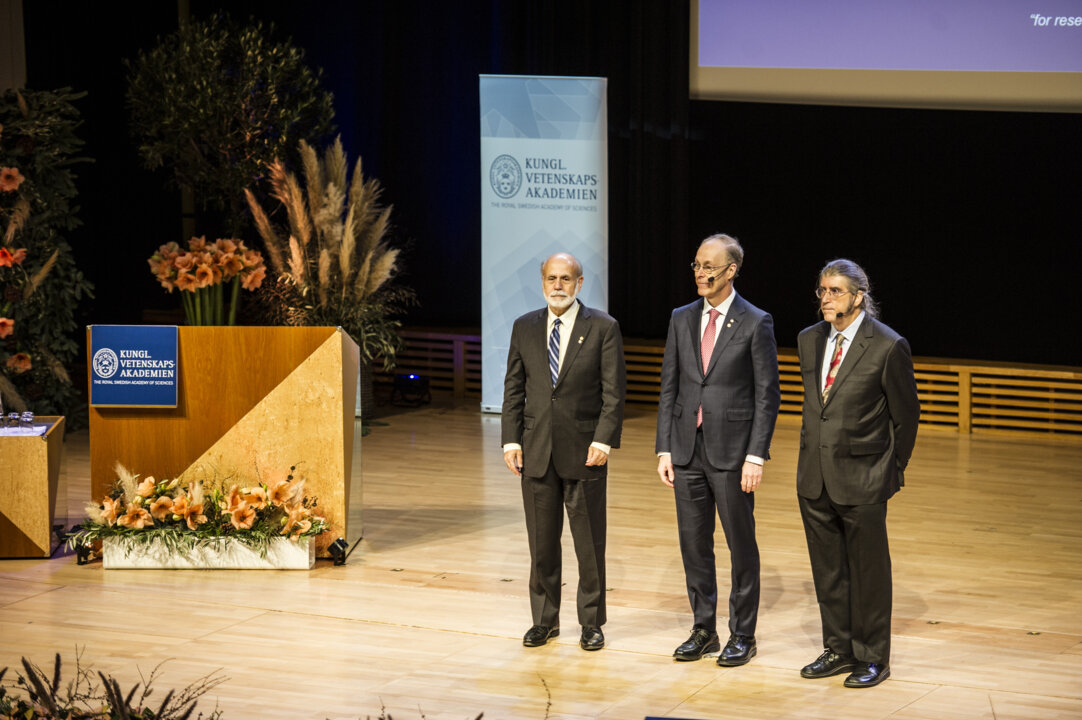 All three laureates in economic sciences assembled on stage after the lectures. From left: Ben S. Bernanke, Douglas W. Diamond and Philip H. Dybvig. 8 December 2022.