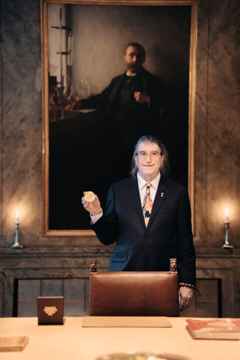 Philip Dybvig showing his economic sciences medal during a visit to the Nobel Foundation on 13 December 2022.