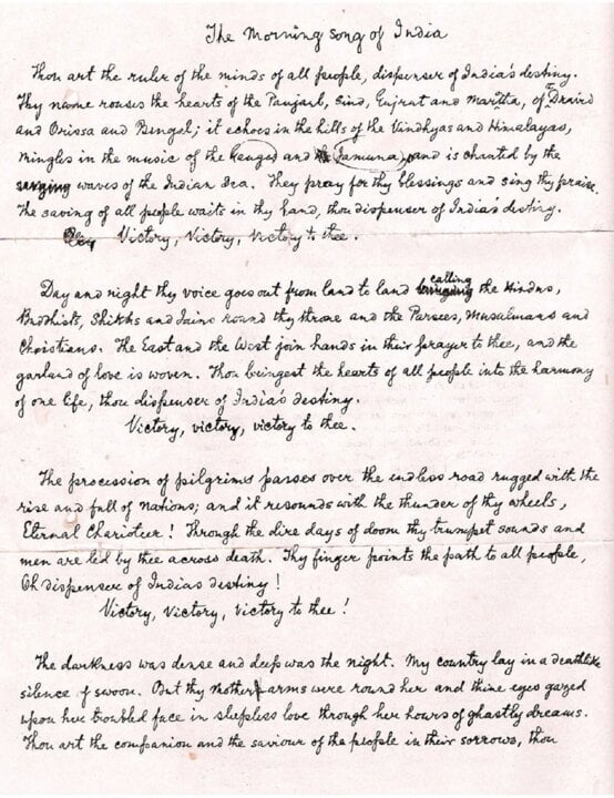 The English translation of the national anthem of the Republic of India, 'Jana Gana Mana', written by Rabindranath Tagore, in his own handwriting, created on 28 February, 1919 during his visit at the Besant Theosophical College.